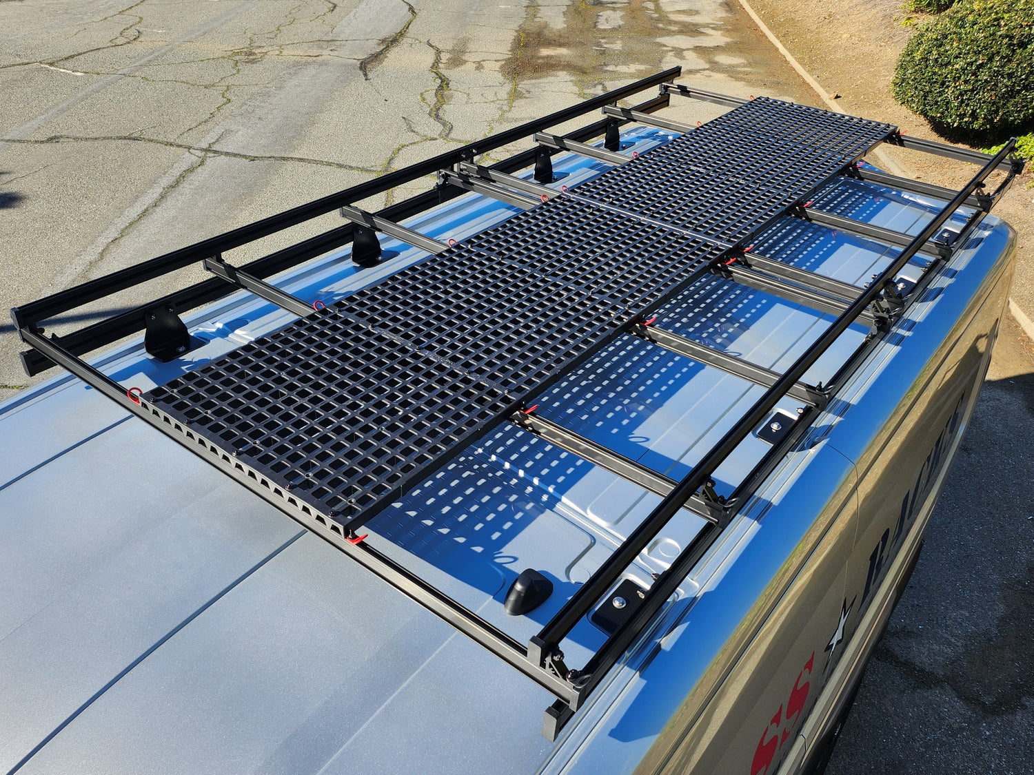 Complete commercial/contractor roof cargo/lumber racking systems for use with Ford Transit, Mercedes...