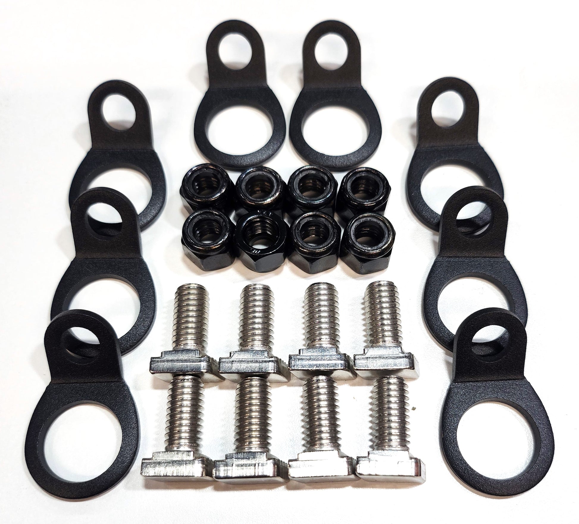 Included is our stainless steel T-Bolt hardware kit includes a set of eight each of the following components: 3/8"-16 bolts measuring 3/4 inch in length, washers, and nylon-lock nuts. This hardware kit is specifically designed to 'drop' into the side channels of all Boss Racks rails after the rack system is installed, facilitating the secure connection of accessories without having to partially disassemble the rack to slide in additional fasteners.