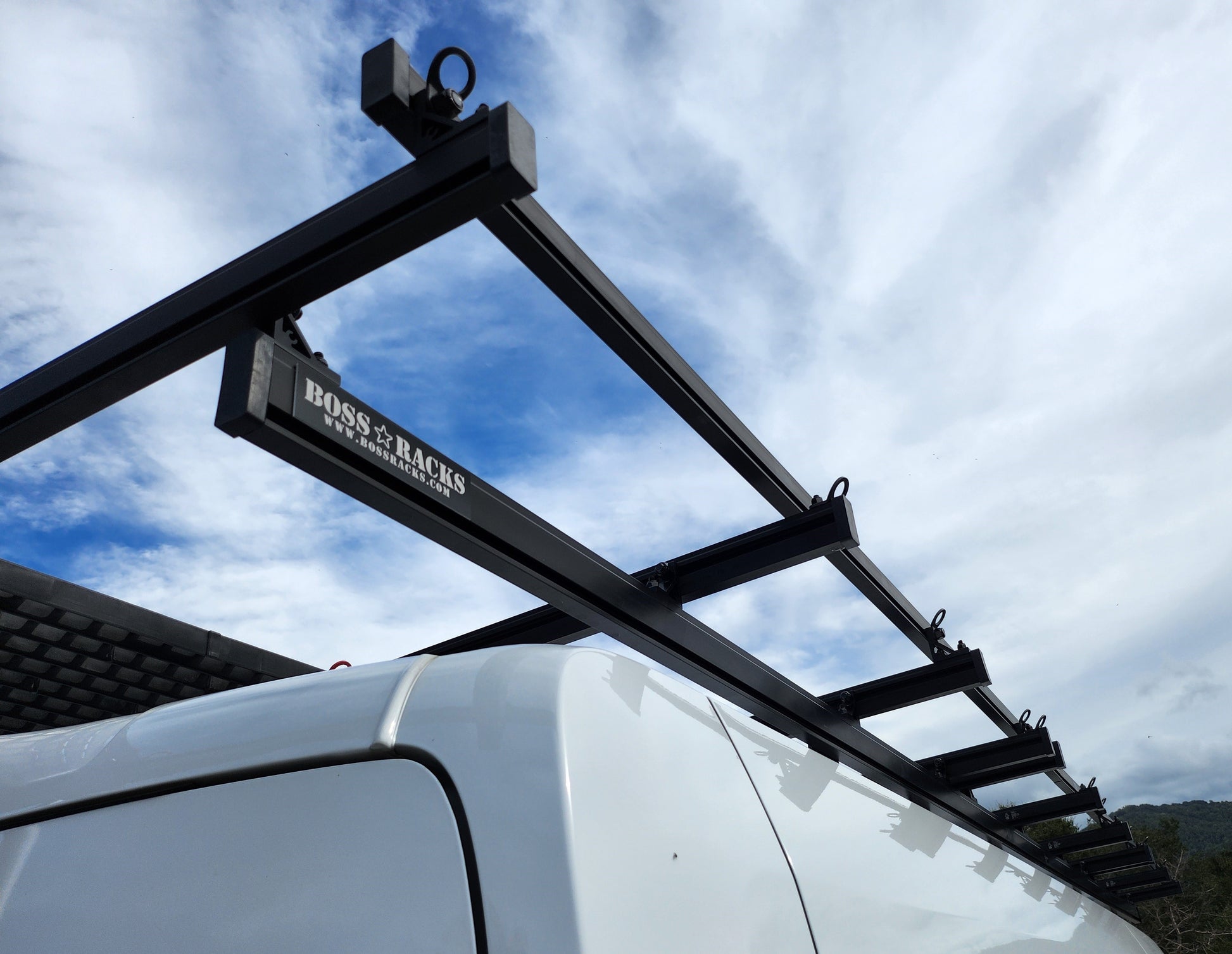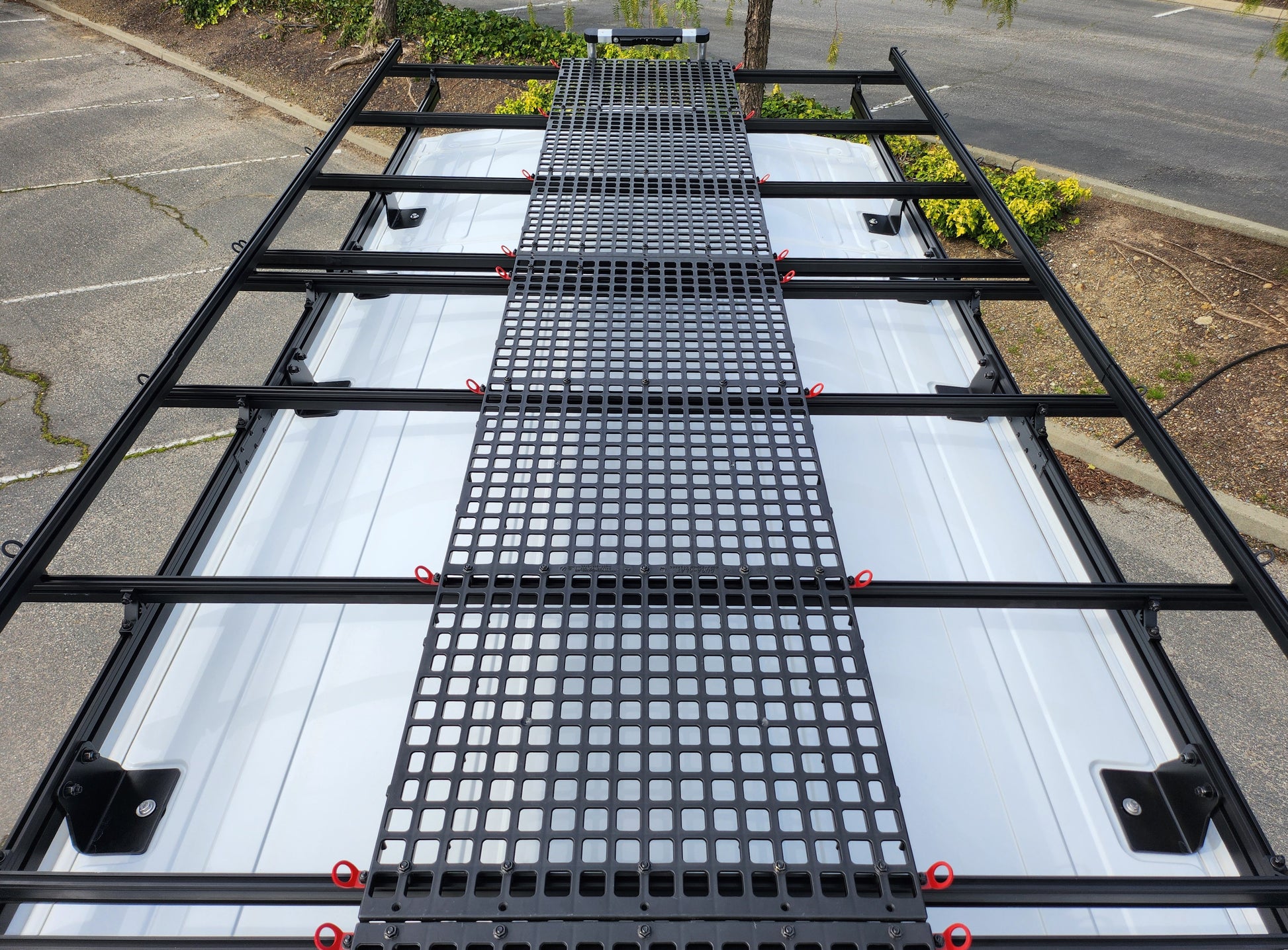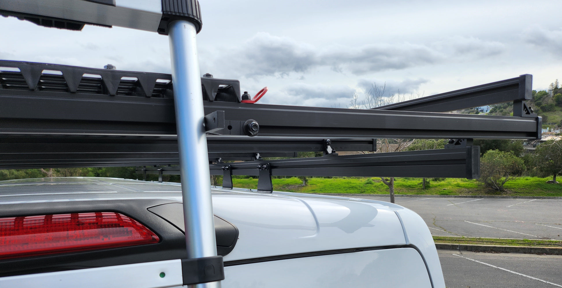 Constructed with rugged anodized aluminum rails and stainless steel hardware, The Scout boasts exceptional corrosion resistance, making it virtually impervious to the elements. In its wide configuration, The Scout comes equipped with eight 75-inch crossbars, maximizing the practical width of the rack. This design ensures that the ends of the crossbars align perfectly with the van's body, providing 22 inches of cargo space on each side of the central walkway.
