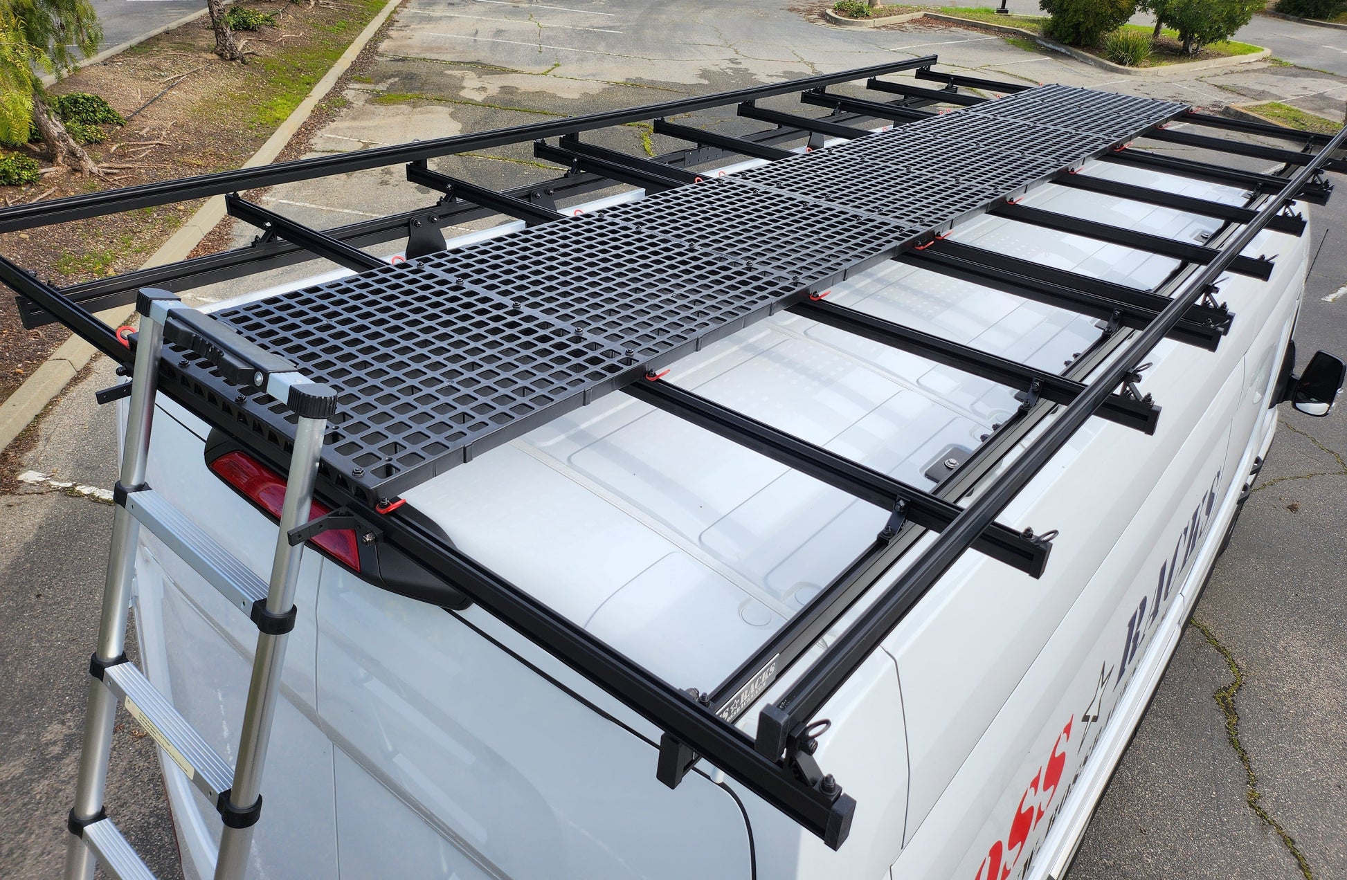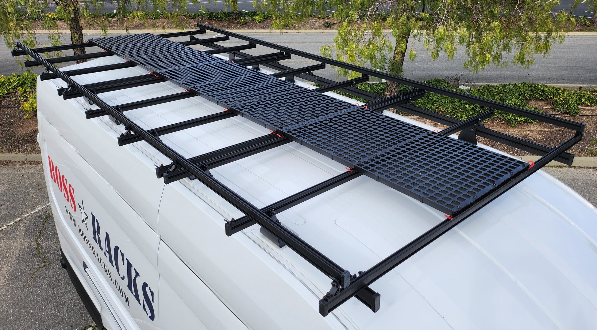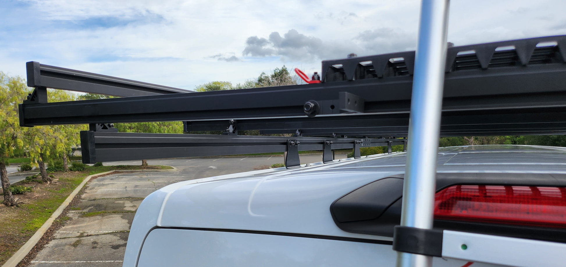 Constructed with rugged anodized aluminum rails and stainless steel hardware, The Scout boasts exceptional corrosion resistance, making it virtually impervious to the elements. In its wide configuration, The Scout comes equipped with eight 75-inch crossbars, maximizing the practical width of the rack. This design ensures that the ends of the crossbars align perfectly with the van's body, providing 22 inches of cargo space on each side of the central walkway.