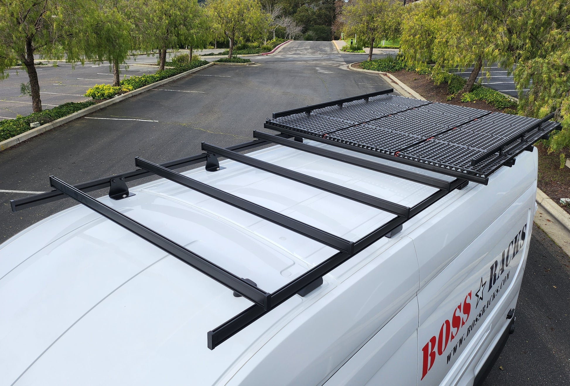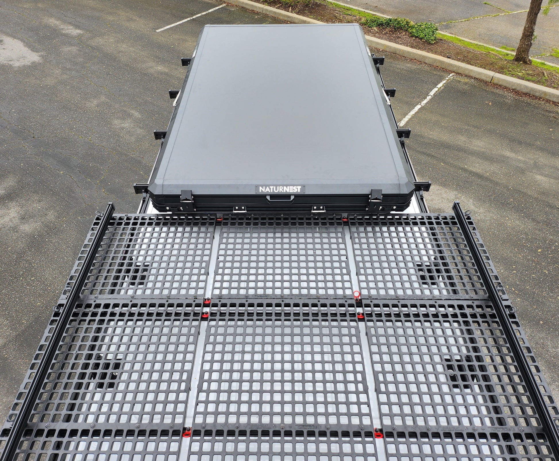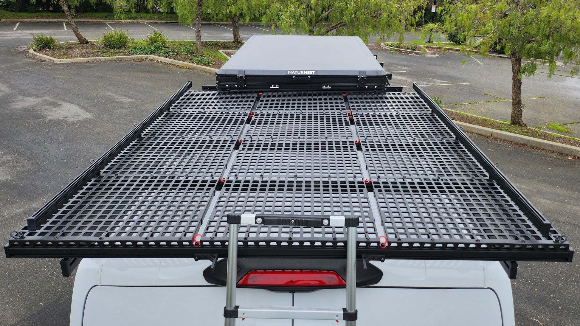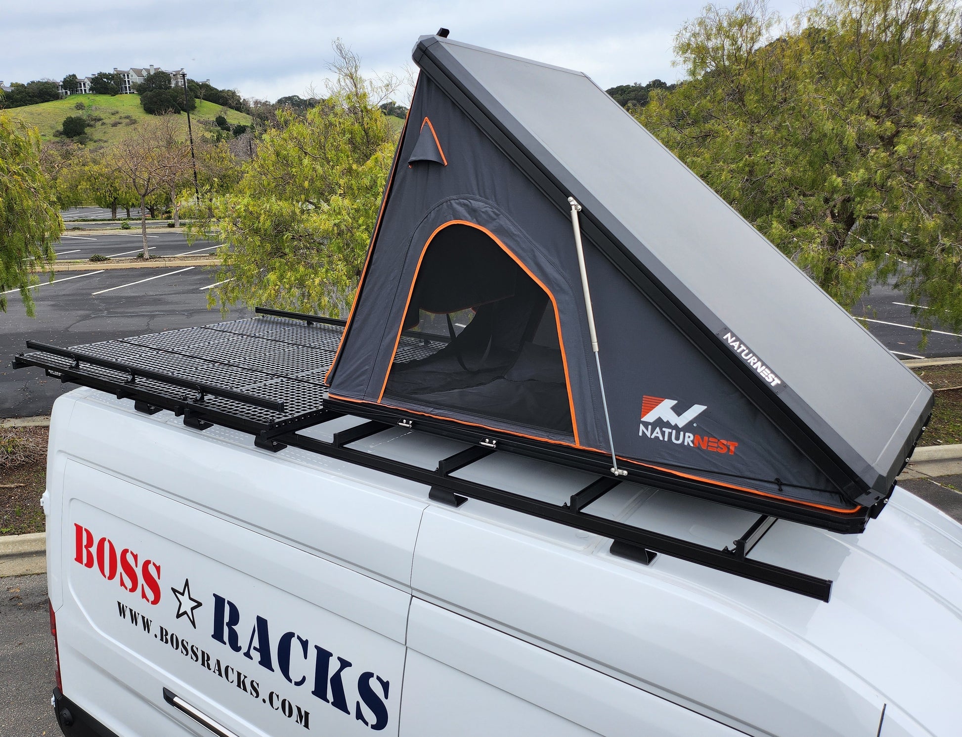 Introducing our innovative Tent Deck, meticulously engineered to accommodate a full-size roof-top tent with rear access, transforming your Ford Transit, Mercedes Sprinter, or Ram ProMaster van into a fully functional living space. Designed specifically for extended-wheelbase vans, this model features a spacious deck measuring 80 inches long by 75 inches wide, supported by our reliable standard-duty rails and incorporating durable polypropylene walking planks.