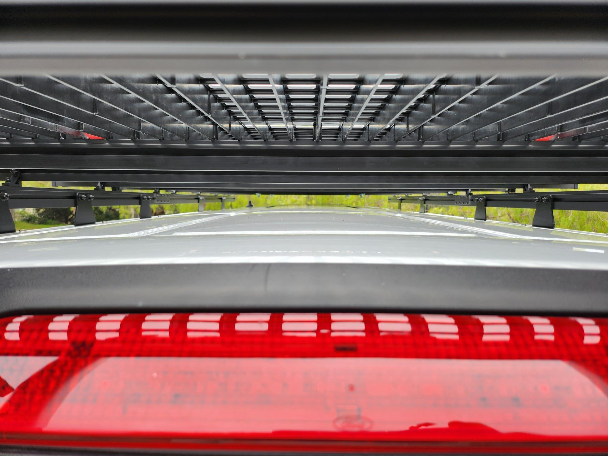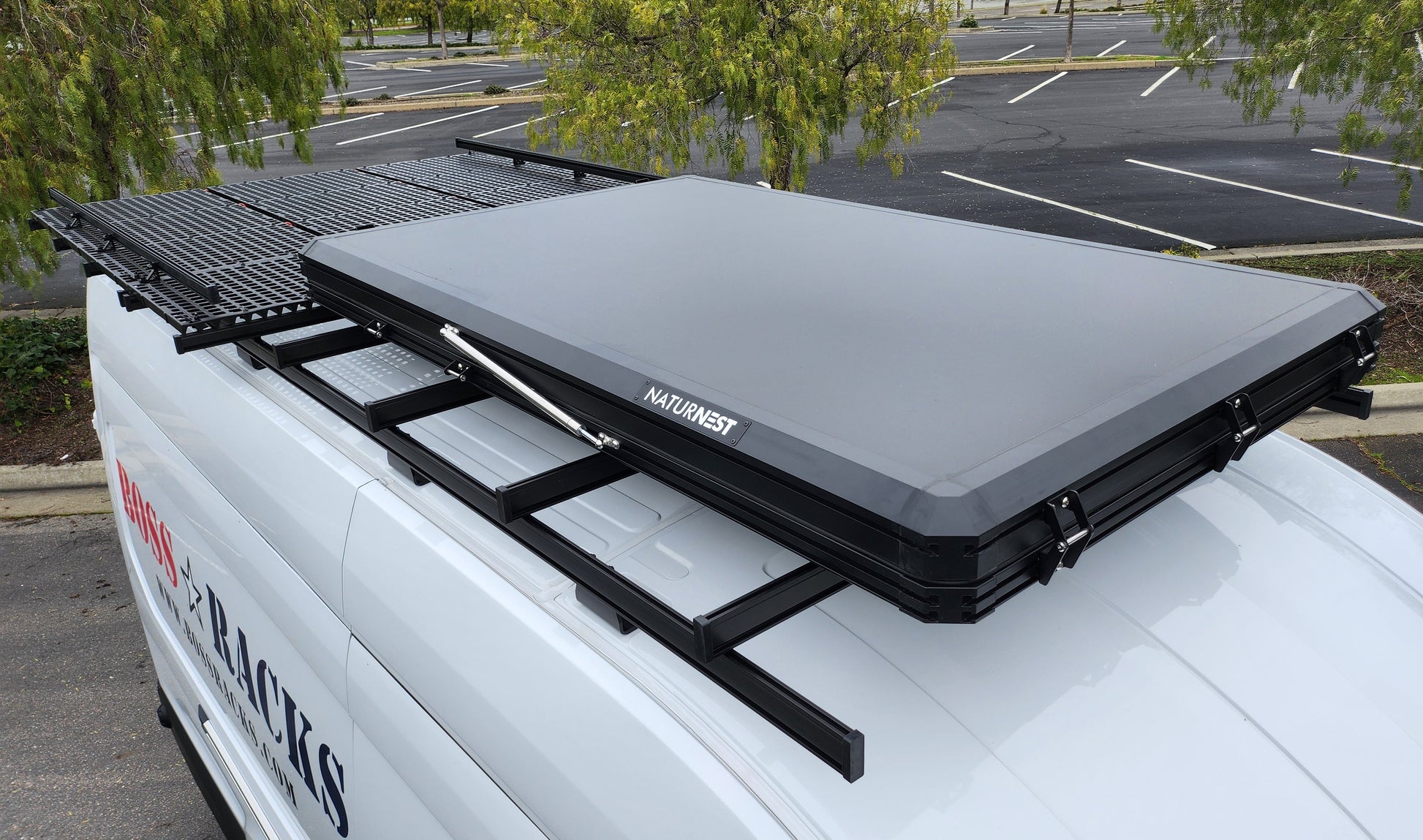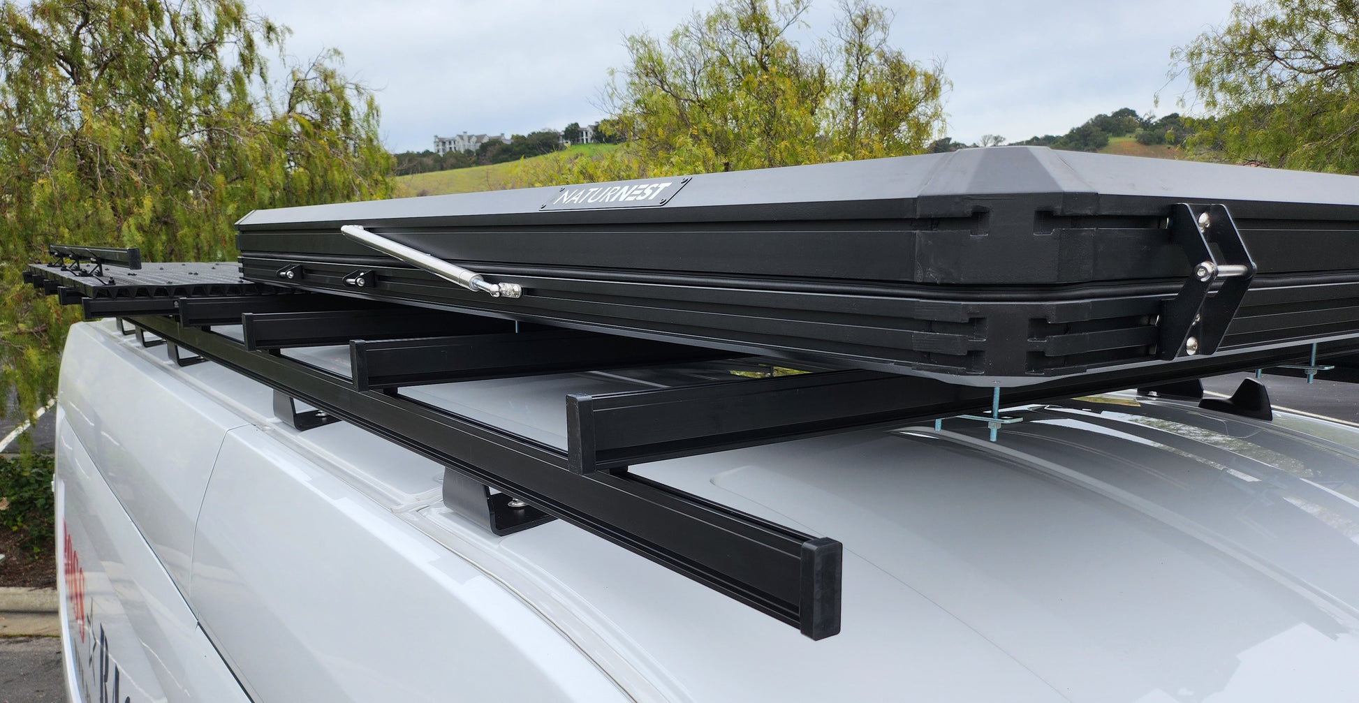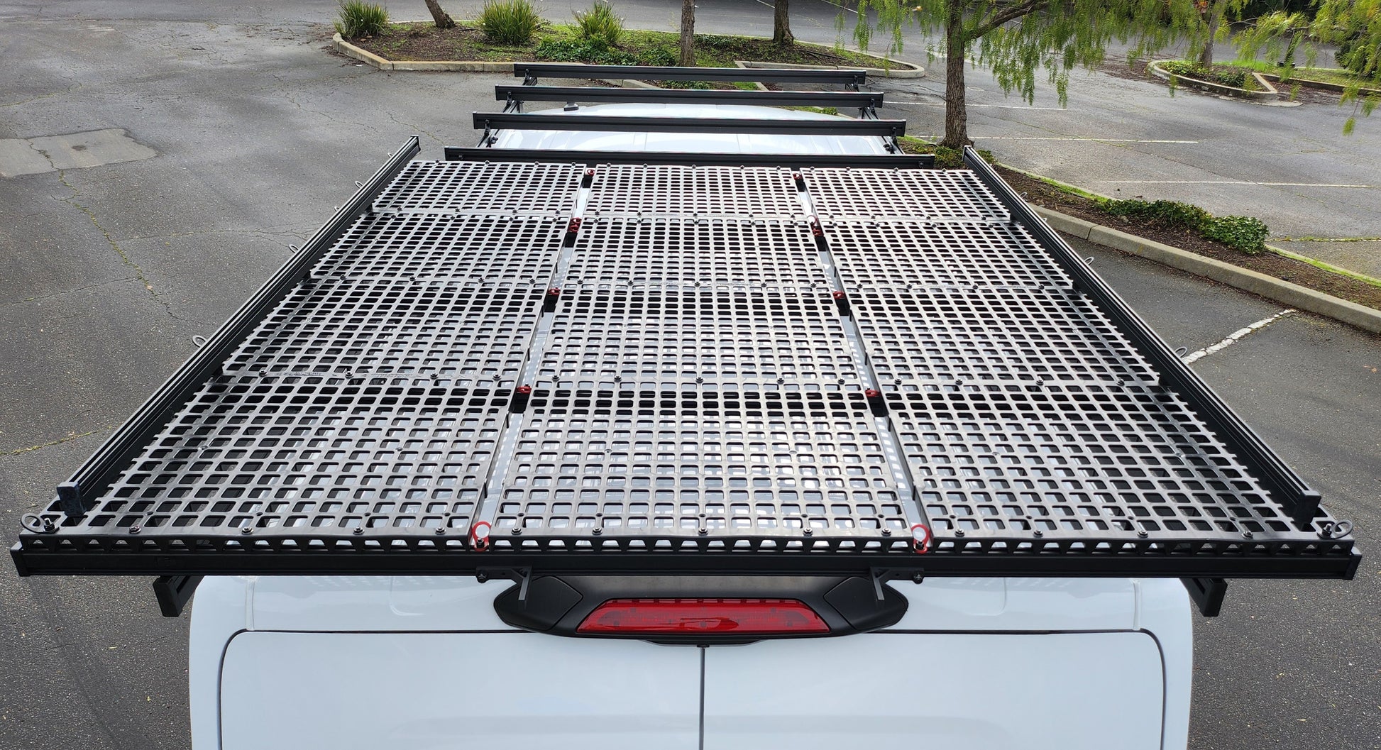 With a total of 24 powder-coated steel tie-down anchors integrated into the deck, you can confidently secure and transport a variety of gear outside your van. While the deck boasts a maximum width of 75 inches, the tent supports are equipped with our heavy-duty cross-bars, measuring 63 inches wide, providing ample strength and stability to accommodate even the largest roof-top tents. (For reference, the tent pictured measures 54 inches wide by 83 inches long.)